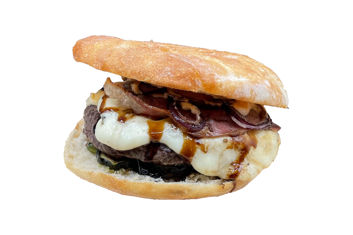 Hamburger di Scottona 200gr, Scamorza Pugliese 110gr, Guanciale, Glassa di Aceto Balsamico, Cipolla, Maionese, Piccante